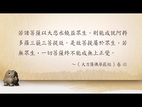 就像《華嚴經》卷40所說︰【若諸菩薩以大悲水饒益眾生,則能成就阿耨多羅三藐三菩提故。是故菩提屬於眾生,若無眾生,一切菩薩終不能成無上正覺。】意思就是說,若菩薩能夠用大悲水來饒益眾生,那麼便能夠成就無上正等菩提,因此說菩提屬於眾生,如果沒有眾生,一切菩薩終究不能成就無上正等正覺。所以,我們修菩薩道、行菩薩行,得要把眾生擺在最前面;就像三歸依時所發的四宏誓願,首先就是「眾生無邊誓願度」,先要有這個大悲心,有了大悲心才有可能圓成菩薩道。世尊在因地修行的時候,也曾經割肉餵鷹、捨身飼虎等等,種種的本生事跡,就是由於有大悲的願力。